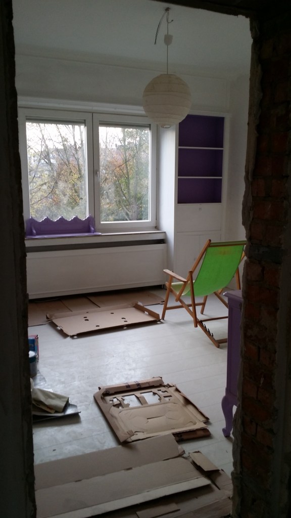 Les jeux de lignes sont variés dans cette chambre. On retrouve, la structure naturelle des murs verticaux qui vont nous donner un sentiment de hauteur. Les lignes horizontales sont timidement présentes, ces dernières seront rehaussées lors de la transformation de la pièce par la création des d’un château en mdf aux lignes variées, ou l’on retrouvera plusieurs éléments de rangements. Même si les lignes ont des directions différentes, celles-ci se complètent dans un jeu très équilibré.