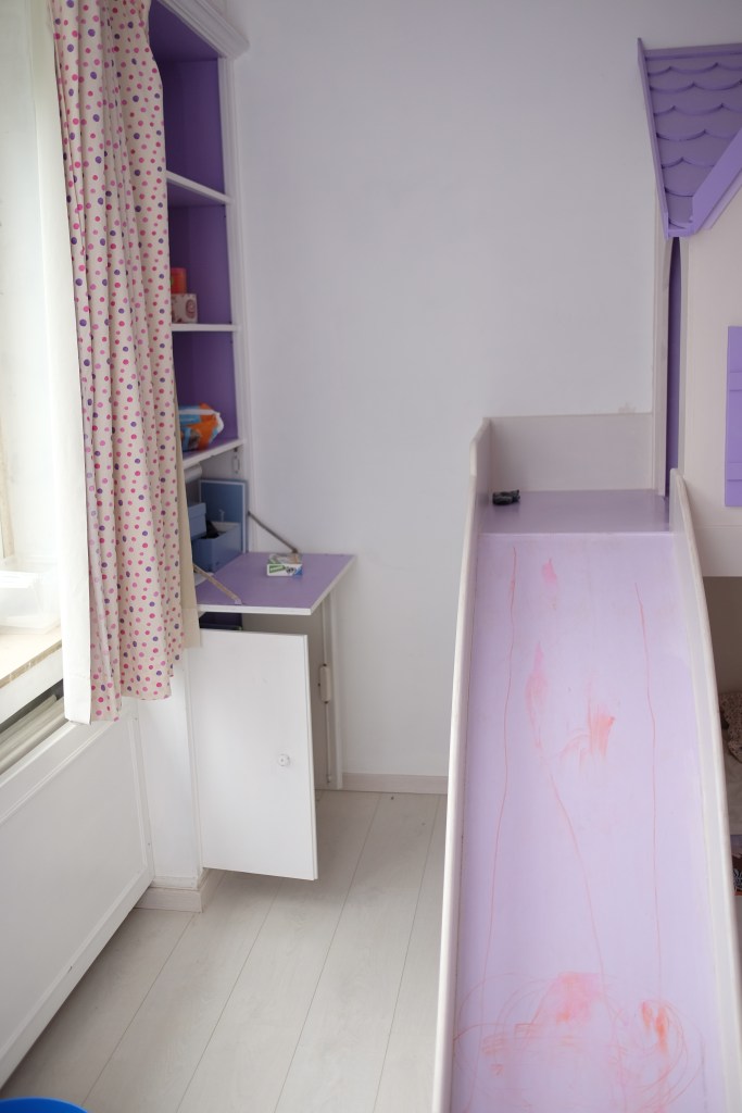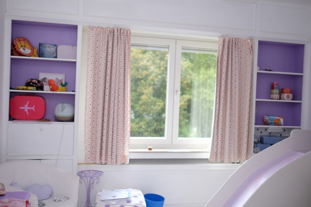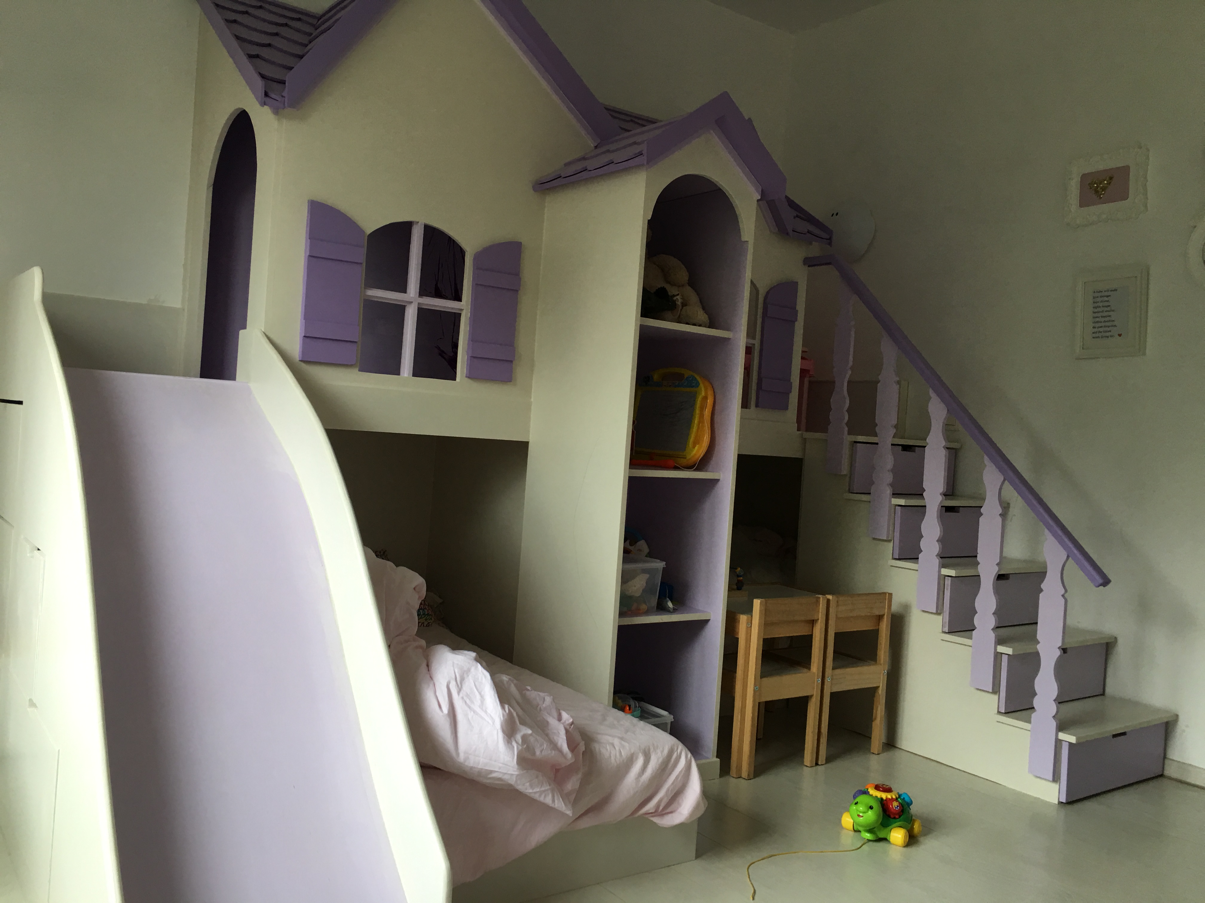 Pour la structure de la pièce, nous sommes dans une architecture assez simple de base carrée, mais intéressante étant donné la présence du châssis centrale qui nous permettent d’obtenir une lumière naturelle à la pièce. Nous sommes ici dans une structure cloisonnée, relativement brute, une ancienne chambre, qui a été aménagé en chambre de petite fille. La grande baie vitrée est insérée dans la structure même du bâtiment et les fenêtres hautes « remplissent » les espaces. Les murs plafonnés sont peints dans une couleur claire pour agrandir encore un peu plus l’espace. La structure en bois sera peinte en blanc crème ou l’on viendra ajouter du violet afin d’égailler la pièce. Au niveau des formes, on reste dans du mobilier assez simple, aux lignes géométriques, notamment pour le canapé, mais le contraste est créé en plaçant le château en son centre remplissant les hauteurs et largeurs. On retrouve également des formes rondes dans la décoration avec le pouf, les luminaires, le cadre …